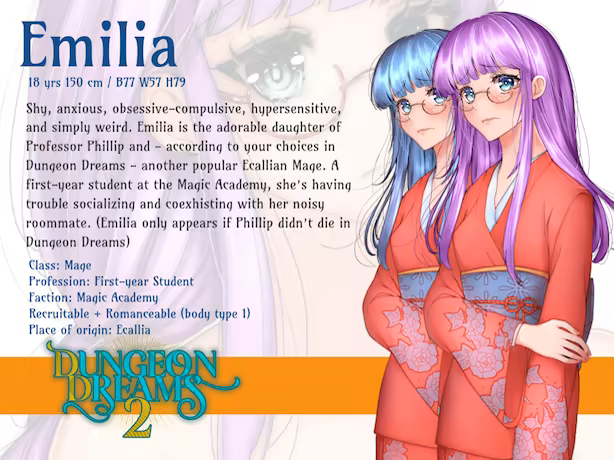 This is the sequel to Dungeon Dreams, but can be played as a new game as well. You play as the child of the Champion of Ecallia, who moves to the big City of Kalmaruss to take part in an important Challenge led by Lady Elwing, one of the Triarch of the Magic Academy. The winner will be literally given the keys to the City and the Academy, so what are you waiting for? Join Victor, your childhood friend, who’s already studying at the Academy and who saved a spot in the dormitory just for you! Explore freely the City during day and night, discovering highlights such as the Merchant’s Guild, Konrad’s weapon shop, the Elven Community, or sit down for some fine sushi with your friends, at the gourmet restaurant with fresh fish taken directly from the lake surrounding Kalmaruss.